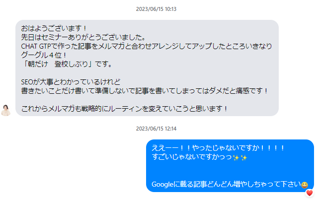 ※6月に今回の書籍の内容×ChatGPTを使ったライティングセミナーを開催していますその記事が3ヶ月たった今Google検索1位になっていました~!!↓一番上の記事です^^
