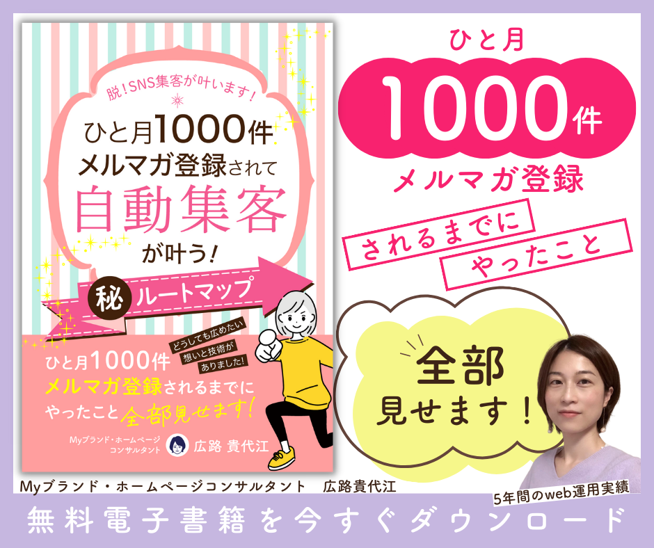 広路貴代江です。こんばんはー!!ハロウィーン日に予告した小冊子、いよいよリリースです!==========\脱!SNS集客叶います!/ひと月1000件メルマガ登録されて自動集客が叶う!マル秘ルートマップ==========私が運営担当を務めるホームページ『パステル総研』がひと月1000件メルマガ登録されて自動集客を叶えるまでにやったこと全部見せます!パステル総研主宰吉野加容子さんはこうおっしゃっています!