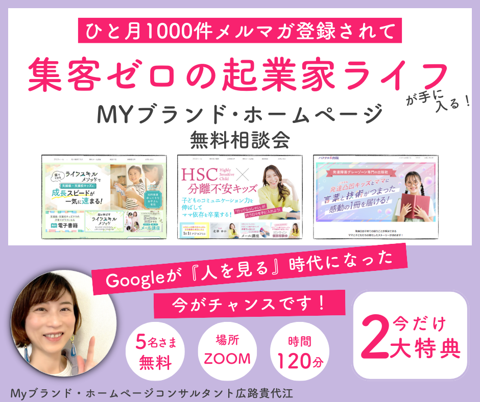 広める力を倍にする挑戦をしませんか?今年上手く行ったSNS投稿を活用して自分だけの集客ツールMyブランドホームページが作れます!ママ起業家として子ども時間も夢を叶える時間も生徒さんを全力でサポートする時間も全部手に入れたいなら私が全力でサポートします。はじめるなら