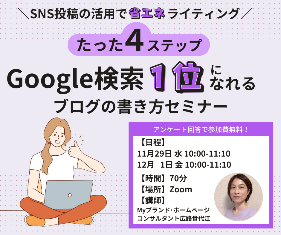 ▼ここからーーーーーーーーーーーーー今まで、記事を書くということは、時間がかかりそうと思って取り組むハードルが高く、後回しにしていました。セミナーに参加してインスタ投稿していることを活用できるんだと気づくことができました。記事を書くときにSEOワードが重要だよとか、構造とか今まで教わってきた知識はあったけど、改めて学ぶことで、こんなにシンプルに書く準備ができるんだってびっくりしました!順番に沿って取り組むことで見つけてもらえる記事を作っていきたいです!広路さんは、どんなことを言っても受け止めてくれるので相談しやすかったです!参加者の方とのちょっとした会話の中でも専門性があるとわかるので頼りになると思いました!せっかく投稿しているのになかなか見つけてもらえなくて時間ばかりかかるという方におすすめです!記事を書くことから逃げていましたが、取り組むハードルがかなり低くなりました。ありがとうございました^^ーーーーーーーーーーーーーここまでKさん、記事執筆のハードルが下がったみたいでとっても嬉しいです!!ぜひ4ステップを意識して記事執筆にチャレンジしてくださいね!◯◯◯さんもせっかく頑張ったインスタ投稿を活用してwebでも選ばれる専門家になれたらどうですか?シンプルな手順で