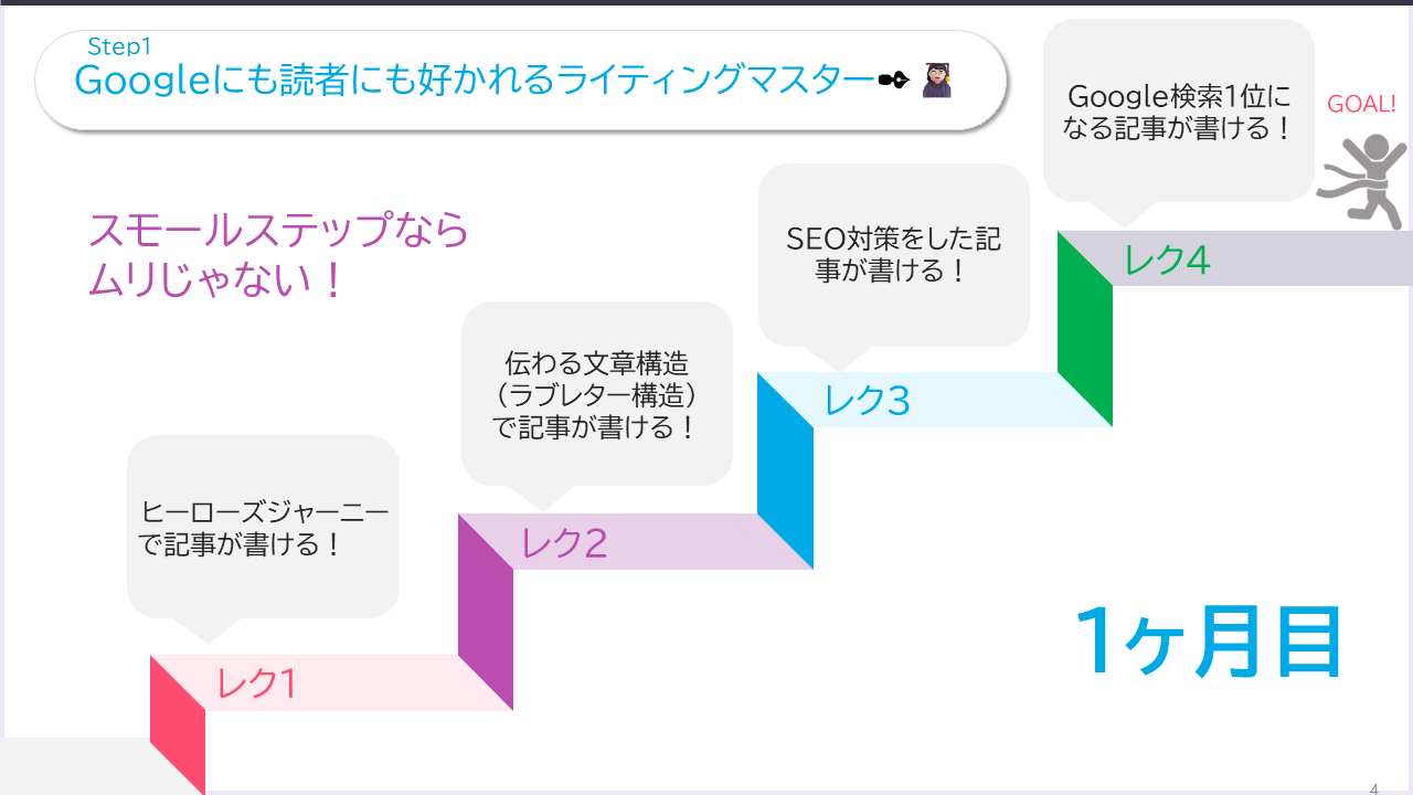 1.誰だって記事は書ける!ヒーローズジャーニーで記事を書く↓2.伝わる文章構造(ラブレター構造)で記事を書く↓3.SEO対策をした記事を書く↓4.Google検索1位になる記事を書くこんな4つのスモールステップで進めていきます^^私の元でホームページを作らなくてもすでに持ってるホームページやコミュニティのホームページでOK!ただし、わたしが教えられるのがWordpreesなのでWordpressで作られたホームページをオススメしています。明日は、この講座で