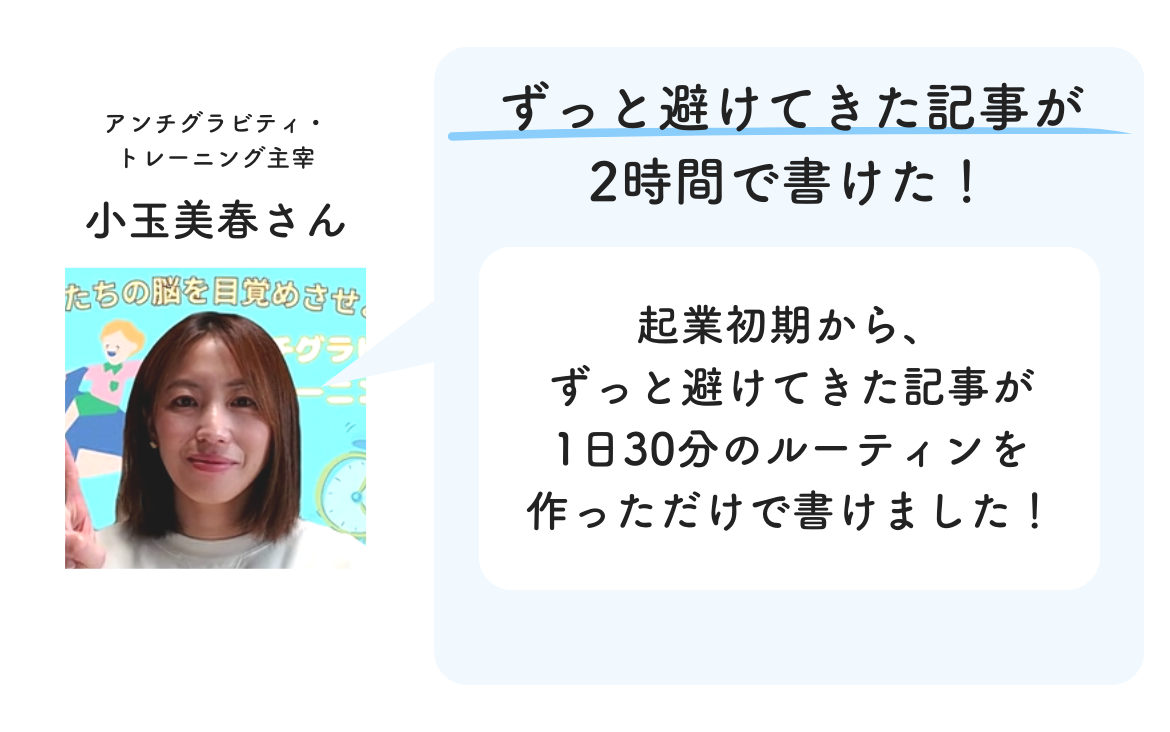 広路貴代江です。おはようございます!今日はライティングを後回しにせず「記事を書く」苦手に向き合うと勇気がいる方を選択した受講生さんをご紹介します^^勇気のいる決断をされた時のお声がこちら▼ここからーーーーーーーーーーーー記事を書いた方がいいのは分かってはいるが、時間がかかってしまうことも想像でき、いつも後回しで、結局着手できずにいました。また、自分のメソッドの広げ方にも悩んでいました。記事が書けるようになったら、語れるようにもなれると思うので「記事を書く」という、苦手を感じている部分に向き合っていこうと決意しました。広路さんは私の想いに共感してくださり、「絶対広めたい!」とおっしゃってくださり、嬉しかったです。記事を書くことができたら、私自身もステップアップしていける!と感じることができました。よろしくお願いします!!ーーーーーーーーーーーーすごい勇気のいる決断をしたと思います☆◯◯◯さんは、この生徒さんが何を決断されて今どう動いているか知りたくないですか??個別相談の時間で、私と一緒に決断したことは何かというと、、、毎日30分記事と向き合う時間を取る!!ということを決断されました!そして、個別相談翌日にはレクチャーに参加!早速30分記事と向き合って成果を報告してくれました!なんと、記事が苦手過ぎて書き始めることすらできなかったこさんが、1記事完成させることができました!!