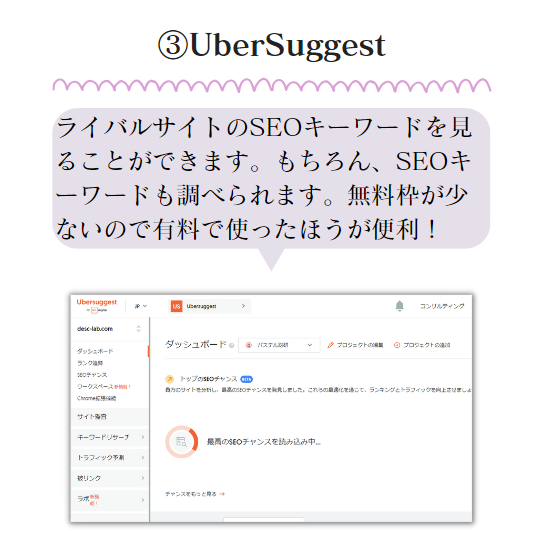 同じくSEOキーワードを調べることができますが、無料枠が少ないので有料で使ったほうが便利です!ライバルサイトの