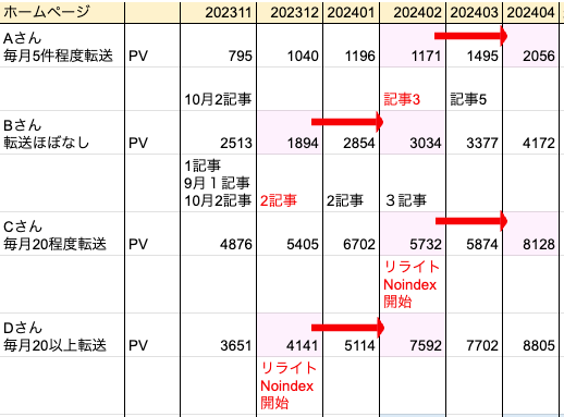 こちら、上の2人が毎月2、3記事づつコツコツと記事を書いたホームページです。(ちなみに下の2人はPVが