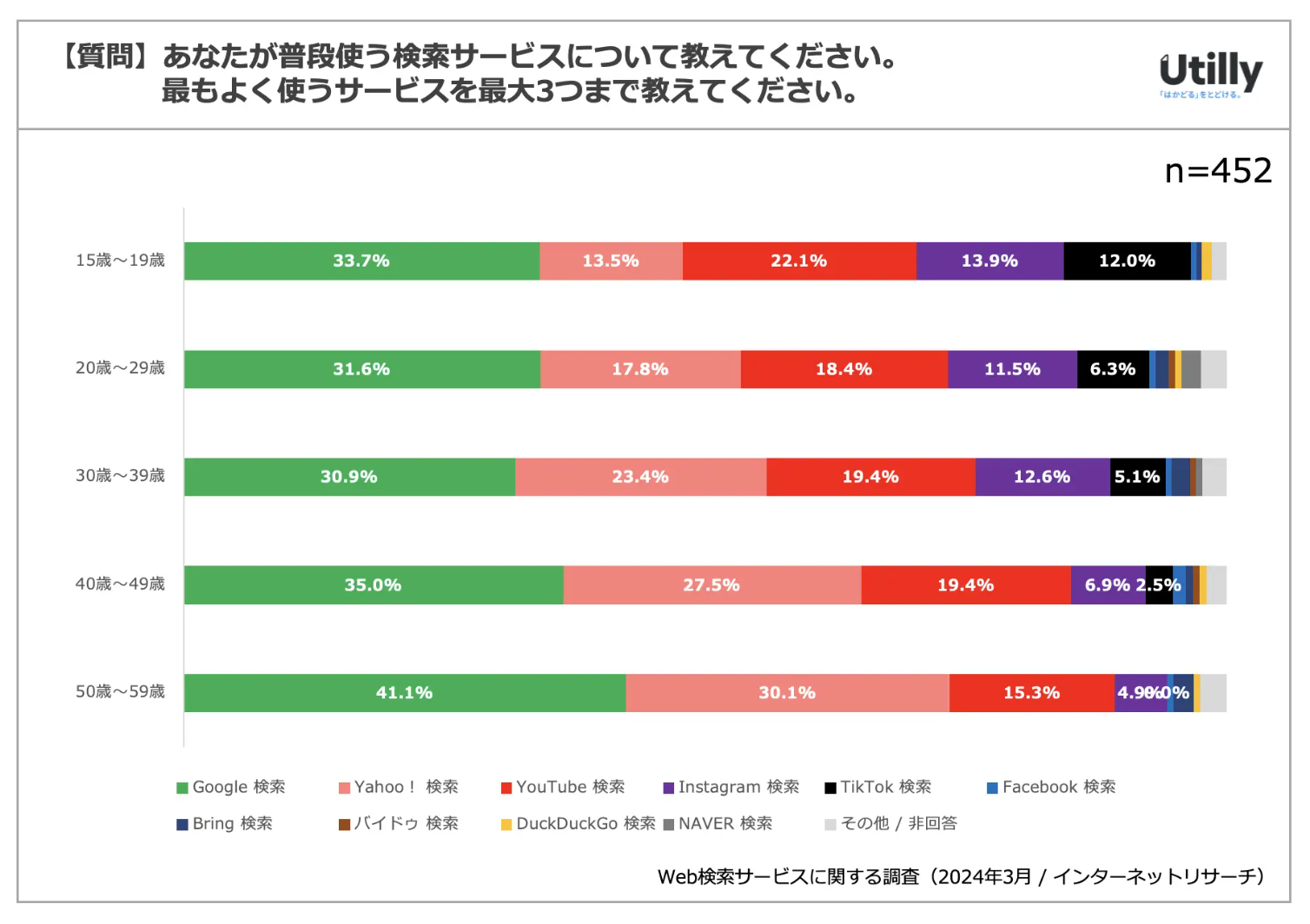 健康と子育てが話題になってしまう40うん歳、ですが(笑)ダンゼンGoogle検索です。30代、40代の普段使う検索サービスってGoogle検索、Yahoo検索が50%以上を占めています!
