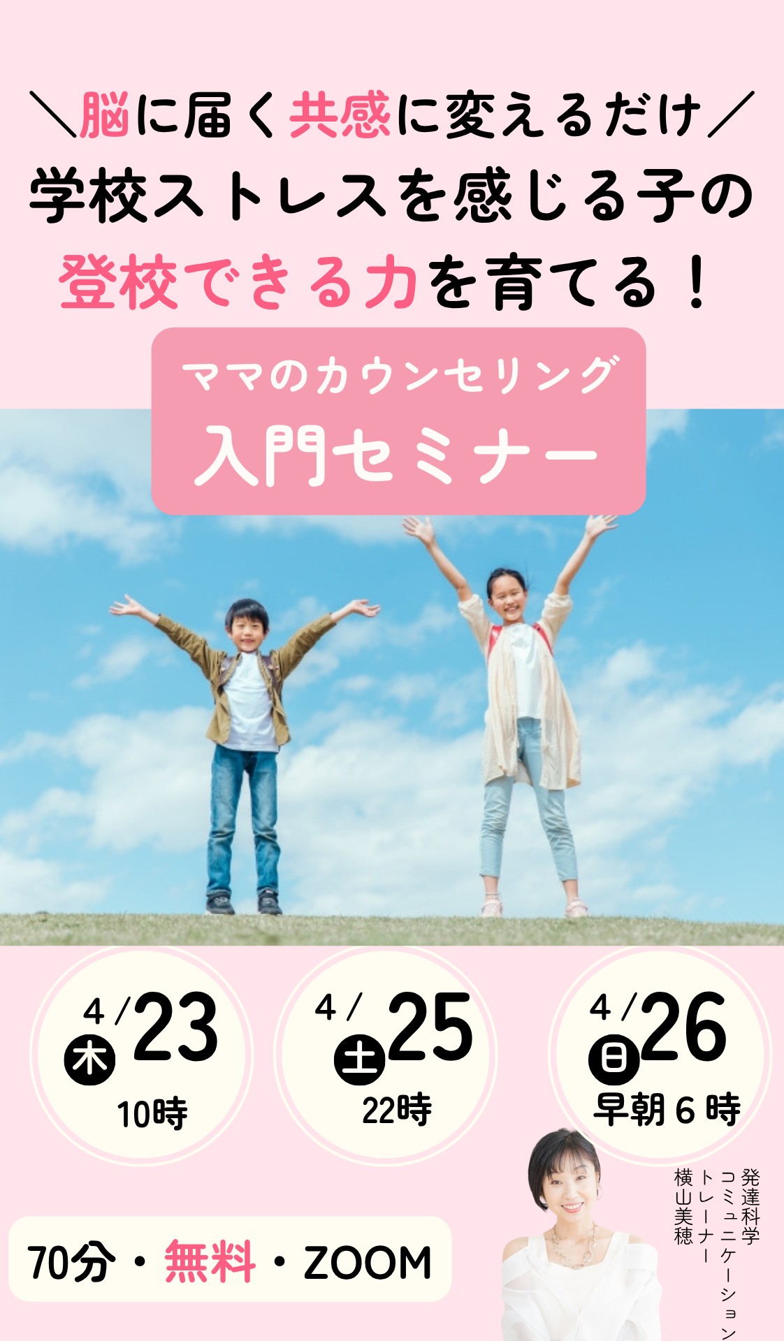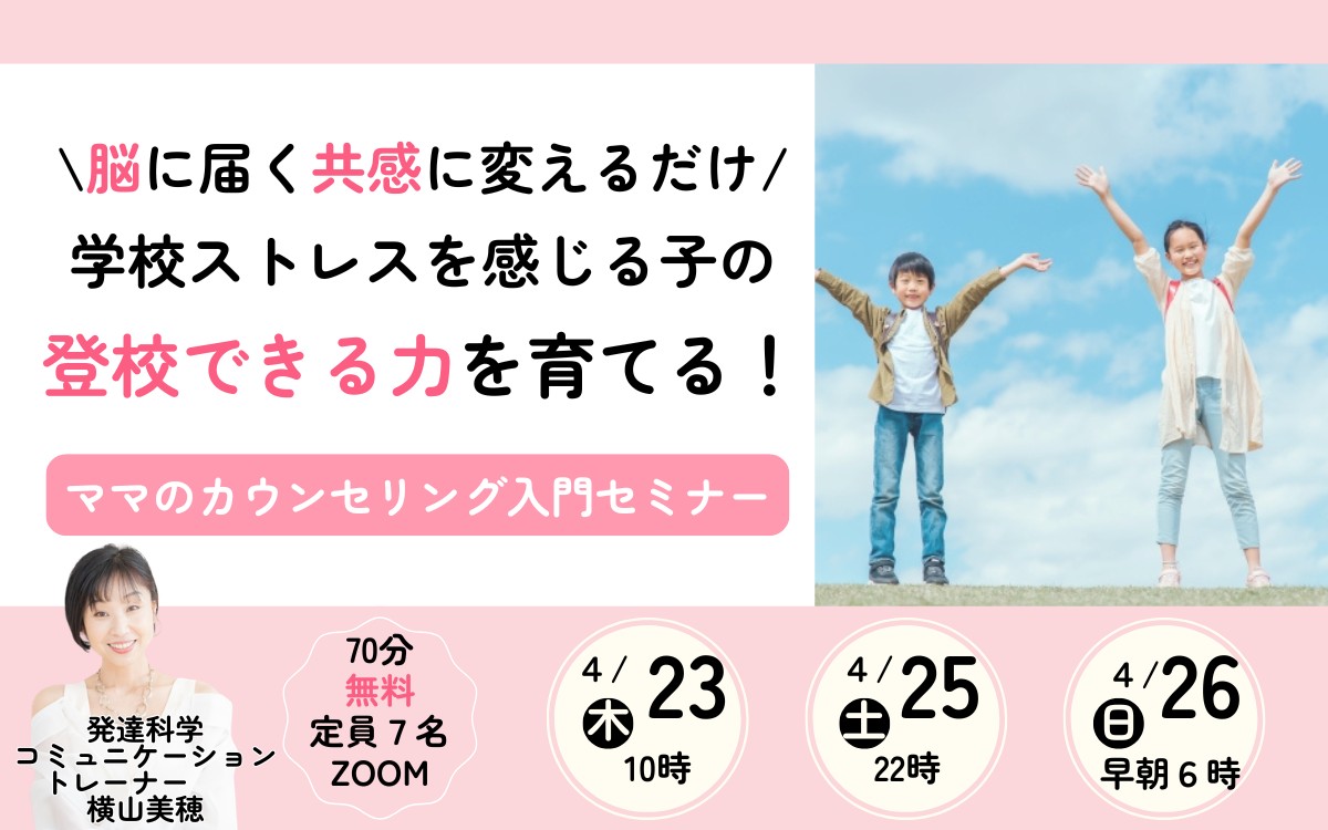 - 【2026-04-20 21:30:00】配信 <申込開始> 学校ストレスを感じる子の 登校できる力を育てる! ママのカウンセリングセミナー