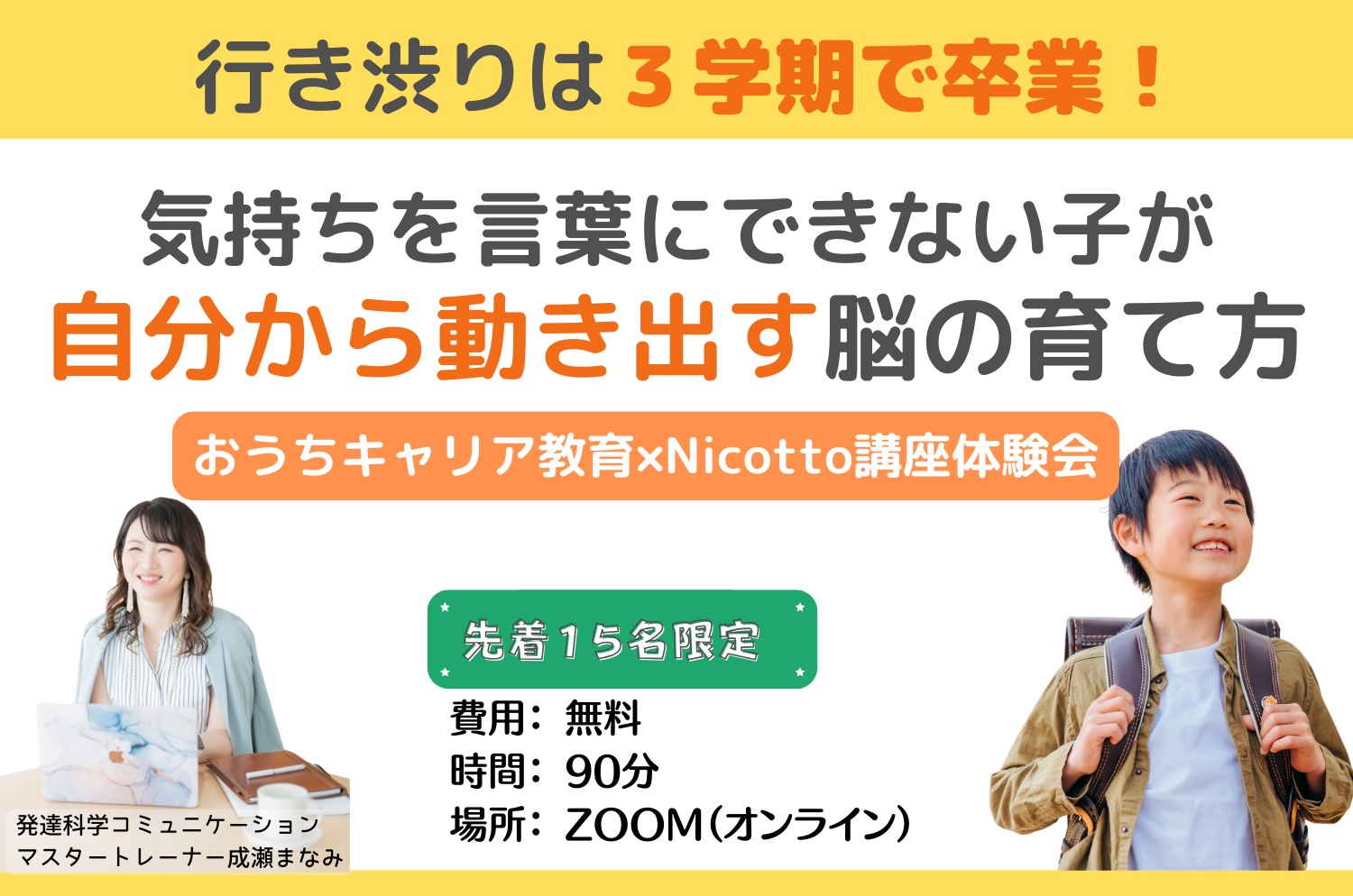 - ◯◯◯さまこんばんは!親子のコミュニケーションで子どもの脳と働く力を伸ばす!おうちキャリア教育発達科学コミュニケーションマスタートレーナー成瀬まなみです。・冬休みの過ごし方に悩んでいます・冬休みがそもそも憂鬱で・・・というご相談が多く、現在受付中の体験会ですがご案内からすぐにお席の半分以上が埋まりつつあります。追加開催は未定なので、「このまま冬休みに入ったら3学期がもっとしんどくなりそう」と感じていたら、ぜひ今日のうちにチェックしてくださいね^^\行き渋りは3学期に卒業!/気持ちを言葉にできない子が自分から動き出す脳の育て方おうちキャリア教育✖Nicotto講座体験会【日時】