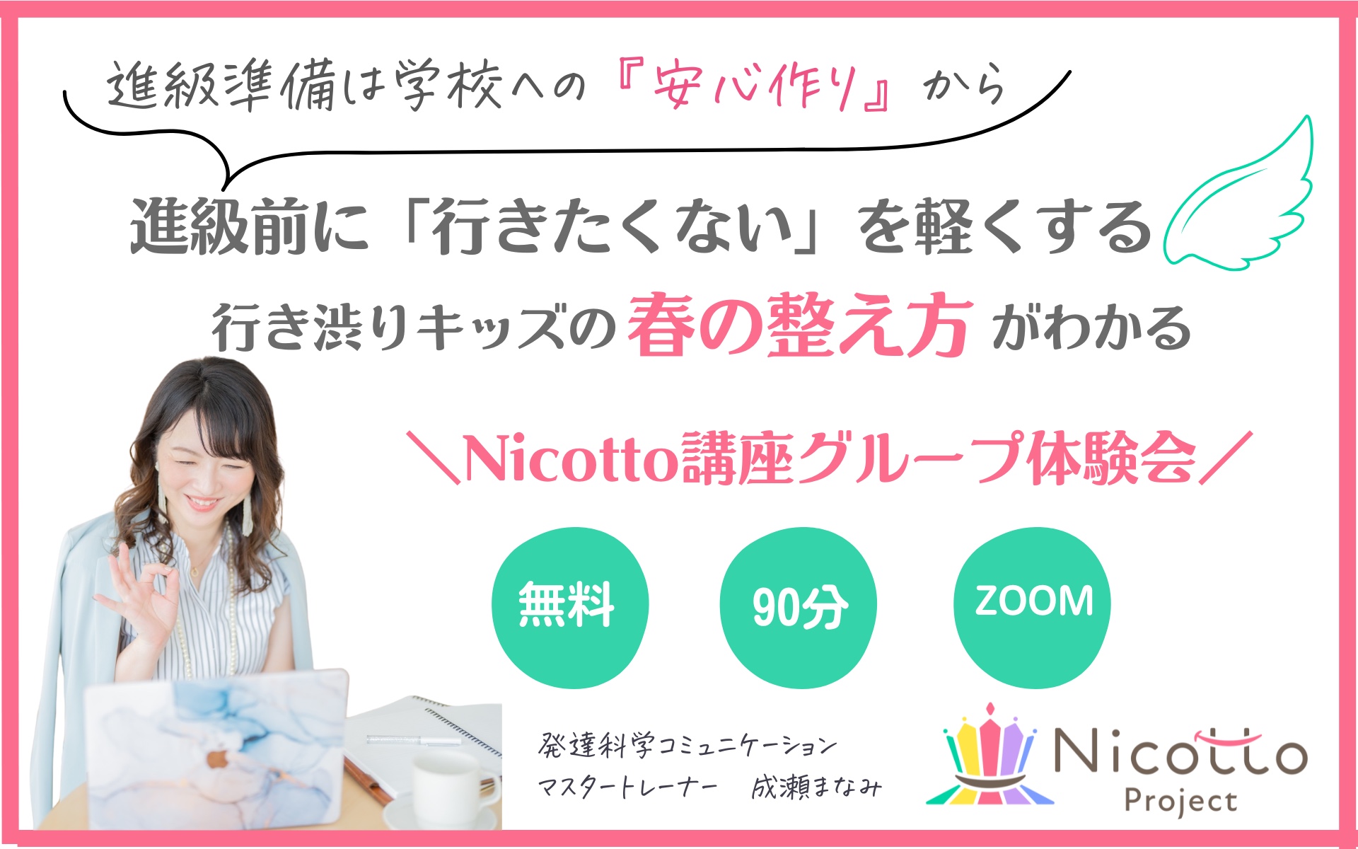 - ◯◯◯さまこんばんは!親子のコミュニケーションで子どもの脳と働く力を伸ばす!おうちキャリア教育Nicotto Projectマスタートレーナー成瀬まなみです。進級・進学に向けて、4月に向けて少しずつ心と脳の進級準備ができる