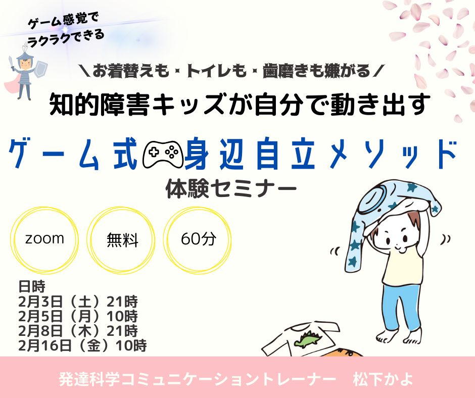 日時:2月3日(土)21時ー22時2月5日(月)10時−11時2月8日(木)21時−22時2月16日(金)10時ー11時参加方法:Zoom参加参加費用:アンケート回答で無料です!セミナーの内容:✔知的障害児の日常生活の困りごとの本質の原因✔ すぐにできる!お子さんが行動できる指示とは?✔ 知的障害児子育てお悩み相談&アドバイスセミナーの特典:✔ 知的障害児専用 【行動を学ぶ力】をつける発達科学コミュニケーション講座スタート個別相談へ無料でご招待✔︎ 脳タイプ分析の特別体験✔︎ 3学期のうちに発達を加速させるサポートプラン