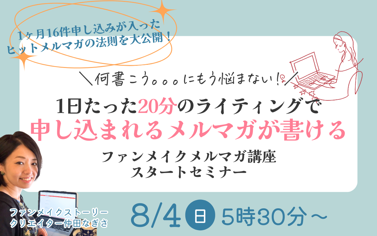 クリエイターの仲田なぎさです^^==========目指せ!1ヶ月でメルマガマスター!特別なご案内です^^==========おはようございます!このメールは先日メルマガで保存ボタンをクリックしてくださった方へお送りしています。この度はファンメイクメルマガ講座にご興味をお持ちくださりありがとうございます!この講座で目指すところは「メルマガを軸に動ける人になる」です。何を発信していいか迷って時間ばかりが過ぎてしまう書いても反応がない申し込みがされないそんな悩みは実はライティング力以上に構成力がものを言います。この講座では週に1回、1ヶ月で4回のレクチャーの中で・ブレないメルマガが書ける1ヶ月のメルマガダンドリ・相手の心を動かす1週間の仕込み・1通20分で書ける1日のライティングこの3つの視点をこれまでわたしがサポートしてきた365日ステップメール構成代行で成果につながった事例をベースにお伝えしていくものです。ライティングは書いてなんぼ!なのでレクチャーの中でワークに取り組む実践型カリキュラムにしています。詳しくはスタートセミナーでお話ししていきますのでぜひご参加ください^^◯◯◯さんとお会いできること楽しみにしています!お申し込みはこちらから▽
