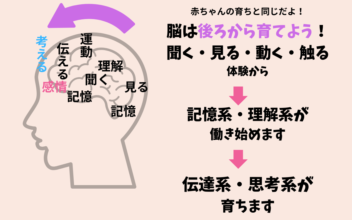 遊びのススメ<親子編>親子遊びと聞くと幼児だけだと思っていませんか?答えは、NO!お子さんが思春期でももっともっと遊んで欲しい!親子関係を修復できている親子関係が良好なご家庭の共通点は一緒に遊んでいます!!!脳を育てる上で、遊びはとても大切です。脳が育つポイントをご紹介しますね。ちょっとこの図を見てください。