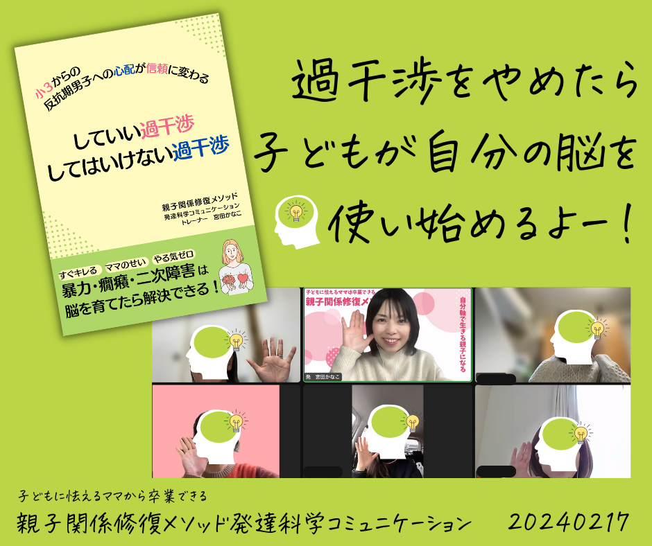 小さな喜びの中から見つかる子どもの成長!毎回レクチャーの冒頭に生徒の皆さんから聴くこのお時間を本当に嬉しく思うんです!その中でもね、特に、嬉しかったのが、先日雪が降って、3時間かけてお車で無事、お仕事から帰宅することができたRさん。すると、頼んでいないのに息子くんは雪かきをしてくれたそうです!Rさんから18歳の息子くんのあたたかいエピソードが聴けてわたしは胸がキュンキュンしました^^どんなに親を奴隷のように扱う子でもどんなに激しい暴言暴力がある子でもどんなに親のことを困らせる子でも本当はママのことが大好きなんですよね。だから、わかって欲しくて反抗しているだけなんです。だけどわかってもらえないから、自分を傷つける子もいるし、周りを傷つける子もいて、何とかして自分を守ろうとしている子どもたち。人は、誰でも自分の気持ちをわかってもらえないというのは、本当に寂しいし、悲しいし、辛いものです。それがやがて怒りに変わることもあります。それは大人も子どもも同じです。どうしてこんなにママを困らせるの?あなたのためを思って言っているのに!もし、こんな気持ちになってイライラが治らないなら、それは過干渉かもしれません。過干渉とは、子どもの脳を使わせない関わりです。代わりに親がいつまでも子どものことで悩み、動き続けるので、やがて、子どもは自分で考えることを放棄してしまうのです。子どもが考えないことも問題ですが、大人も、いつまでたってもお世話のループから抜け出せず、社会問題にもなっている、8050問題だって、他人事とは思えなくなるかもしれません。子どもの脳を伸ばすどころか、子どもに脳を使わせない関わり、それが過干渉です。まだこちらの本をお読みでない方はぜひこの機会にお読みくださいね(^_−)−☆