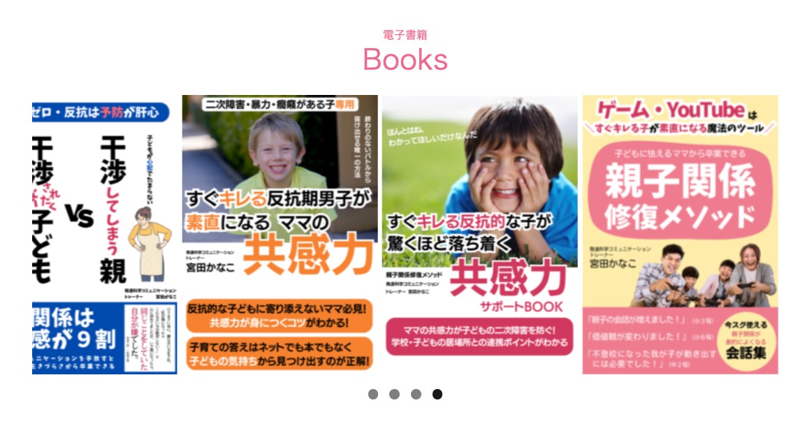 それぞれ画像をクリックしてもらうと私の思いであったり、宮田かなこってこんな人、などがあります。また電子書籍も多数あります!