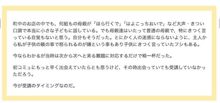 街中のお店の中でも、何組もの母親が「ほら行くで」「はよこっちおいで」など大声、きつい口調で本当に小さな子どもに話している。でも母親たちは、いたって普通の母親で特にキツく言っている自覚もないと思う。自分もそうだった。とにかく人の迷惑にならないように、主人から私が子どもの躾のことで怒られるのが嫌ということもあり、子ともにキツく言っていたフシもある。発コミュにもっと早く出会えていたらとも思うけど、その時出会っていても受講していなかっただろう。今が受講のタイミングなのだ。今こそ、子育てを学ぼう