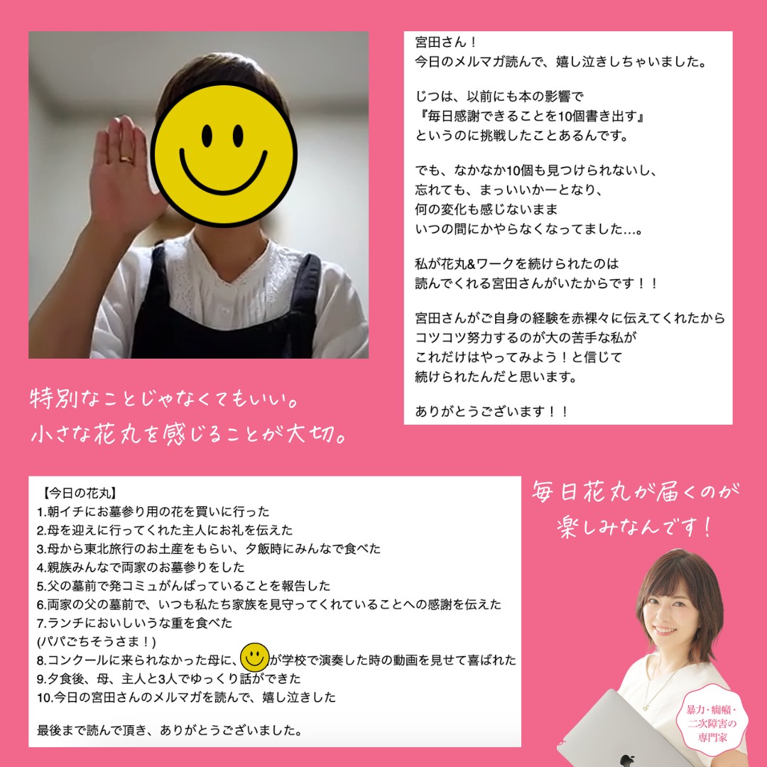私が花丸&ワークを続けられたのは読んでくれる宮田さんがいたからです!!宮田さんがご自身の経験を赤裸々に伝えてくれたからコツコツ努力するのが大の苦手な私がこれだけはやってみよう!と信じて続けられたんだと思います。Yさんはこう語ってくれました。私は嬉しいのですが、ここで大事なのは、私ではなくて、誰と会話をしていますか?ということ。習慣を変えたいのであれば、同じような体験を味わった人や境遇の人でなければ、それができたのは〇〇さんだからでしょ?って思うじゃないですか。言い訳できる逃げ道はいくらでもあるってこと。かつての私は、