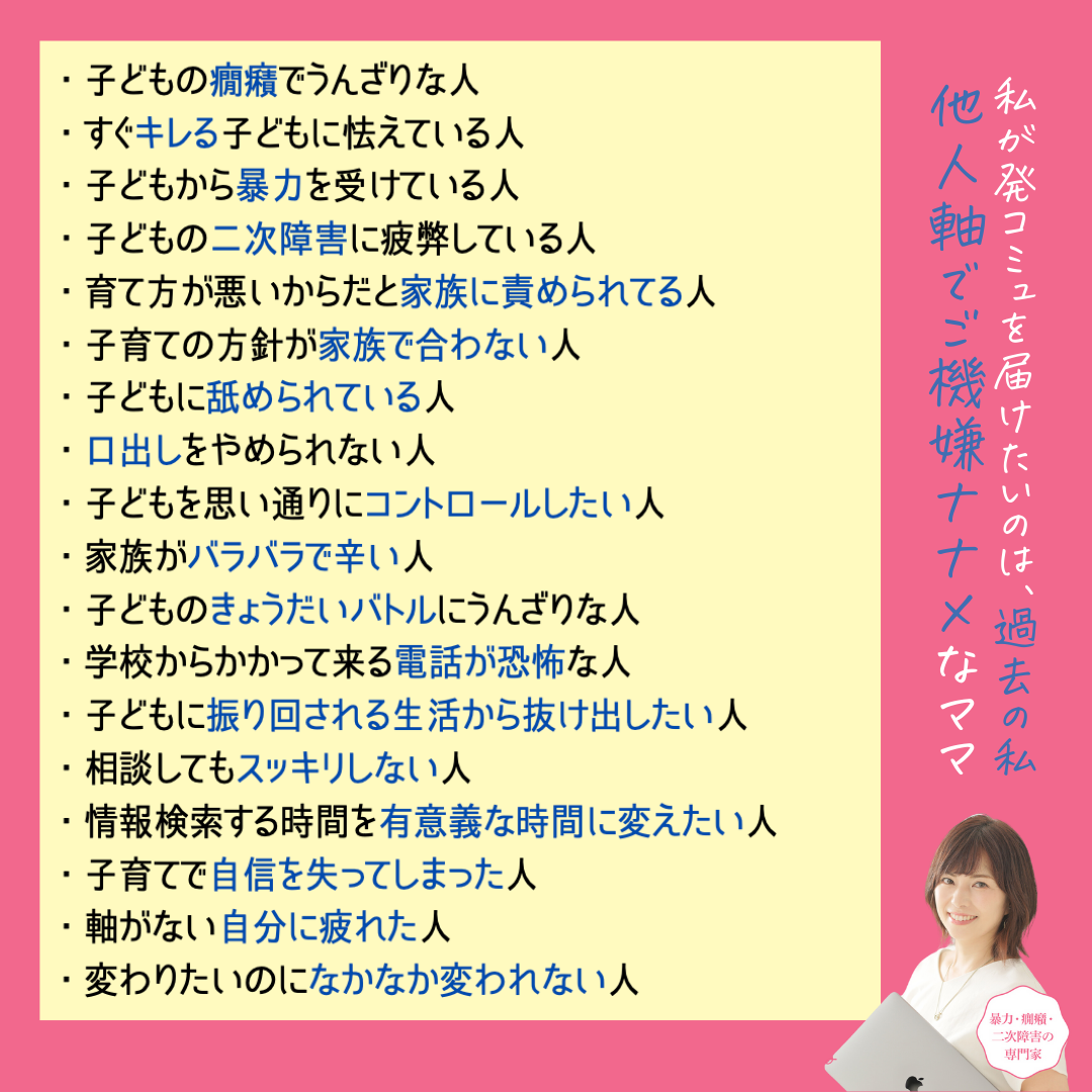 これ、誰にでも使えるじゃん!って思い始めたのです。そして、はじめは子どもの困りごとに困っていたはずなんだけど、子どもの困りごと以上に自分の頭の中がいちばん、大火事を起こしていたことに気づき、私は、とにかく自分、そして目の前のママ(受講生さん)を研究しまくりました。かつての私はこんなママでした。