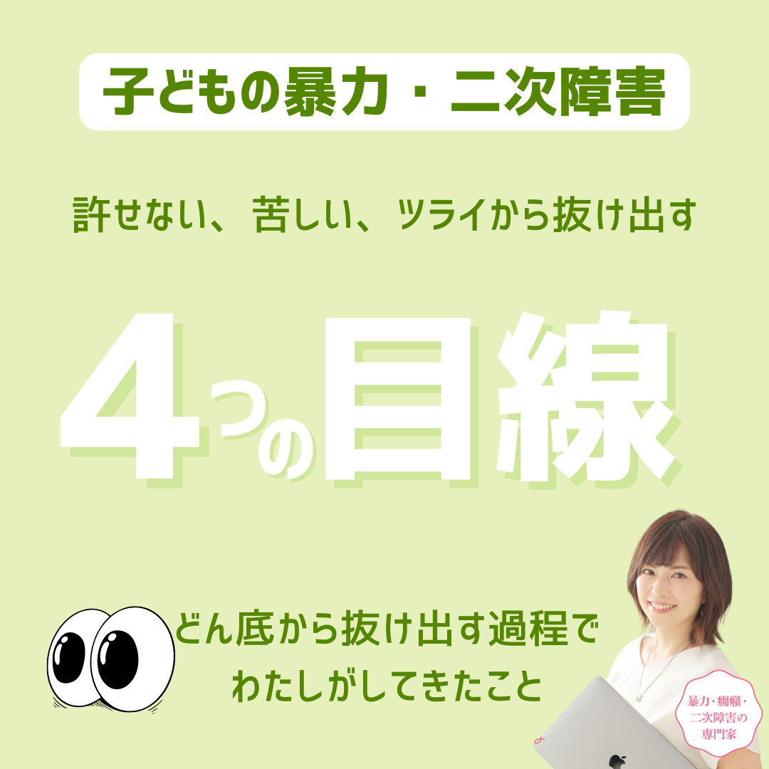癇癪、暴力、二次障害のお悩みから抜け出したいなら!ピンチをチャンスに変える親子関係修復メソッド体験会、詳細・お申し込みはこちらから▼https://www.agentmail.jp/lp/r/12377/118689/ものの見方、捉え方が変わったり、新しい知識を得ることで、ピンチはチャンスに変わります!私が子育て、人生の一番苦しかった時にしてよかったことを今週はお届けしようと思います!今日のおすすめは「4つの目線」です!