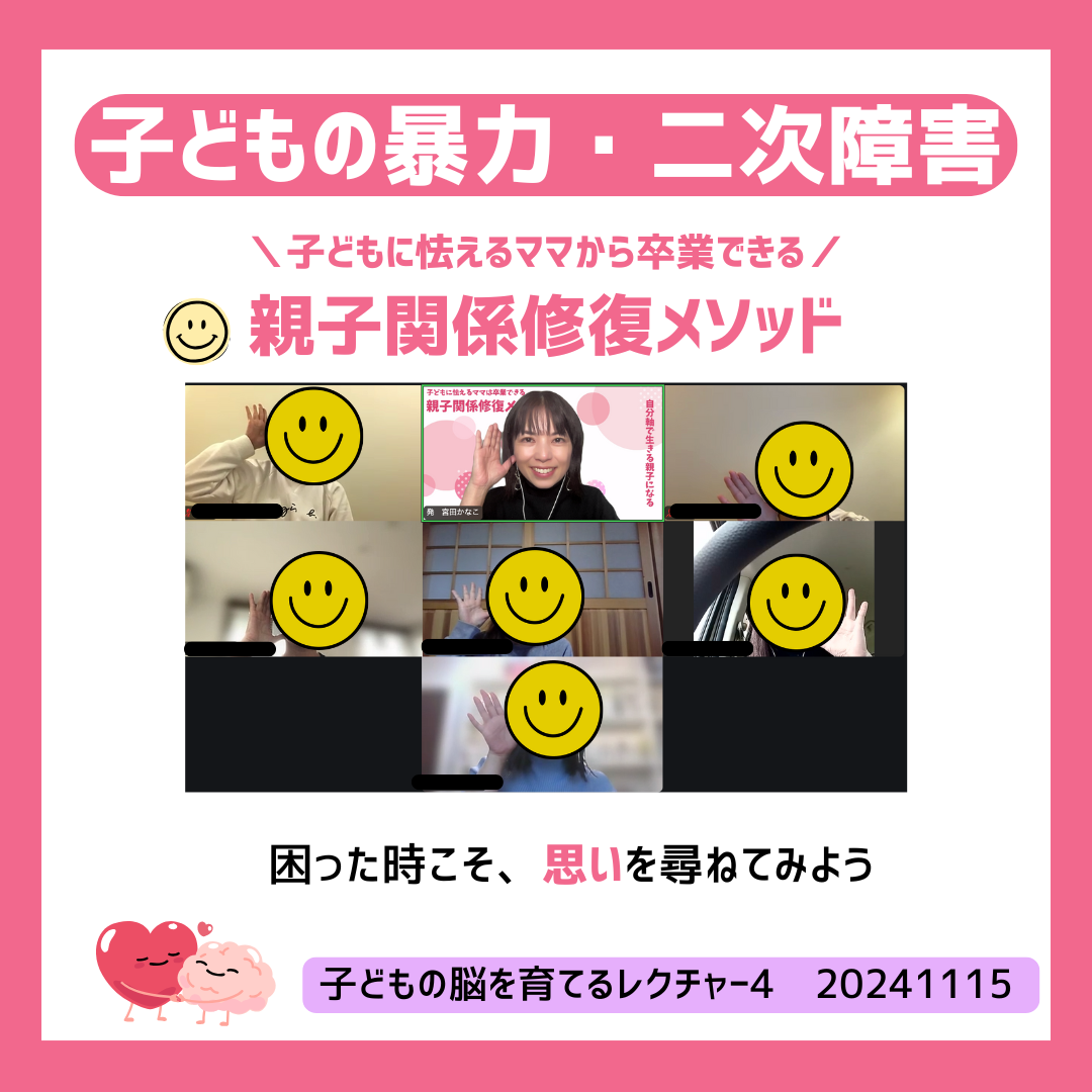 レクチャーの冒頭では毎回、最近よかったことを皆さんでシェアしています!息子がボランディア活動を頑張ってます!(中3・1・小5男子ママ)なんだかんだいって休まず学校に行ってて頑張っているなと思います!(中3小3男子ママ)積極的不登校を思いっきりENJOYできています^^乗馬の大会で二位になったりゲームの家庭教師つけてから大会でたり、成功体験を積み重ねています!(中1男子小1女子ママ)死ね死ねこれまで1万回以上は言われて傷ついていたけれども、あと35年待ってくれる?と言ったらスッとおさまりました!(中1女子ママ)癇癪が治ってきて気持ちの会話ができるようになってきました。(小2男子ママ)肯定の感じが掴めてきてゲームの会話をしていたら膝の上に乗ってきてびっくり!認められるようになりました!(中2男子ママ)皆さんよかったことをたくさん話してくださるようになって嬉しい限りです!そんな中でも私が今日のレクチャーで受講生のMさんの話より、心に残った