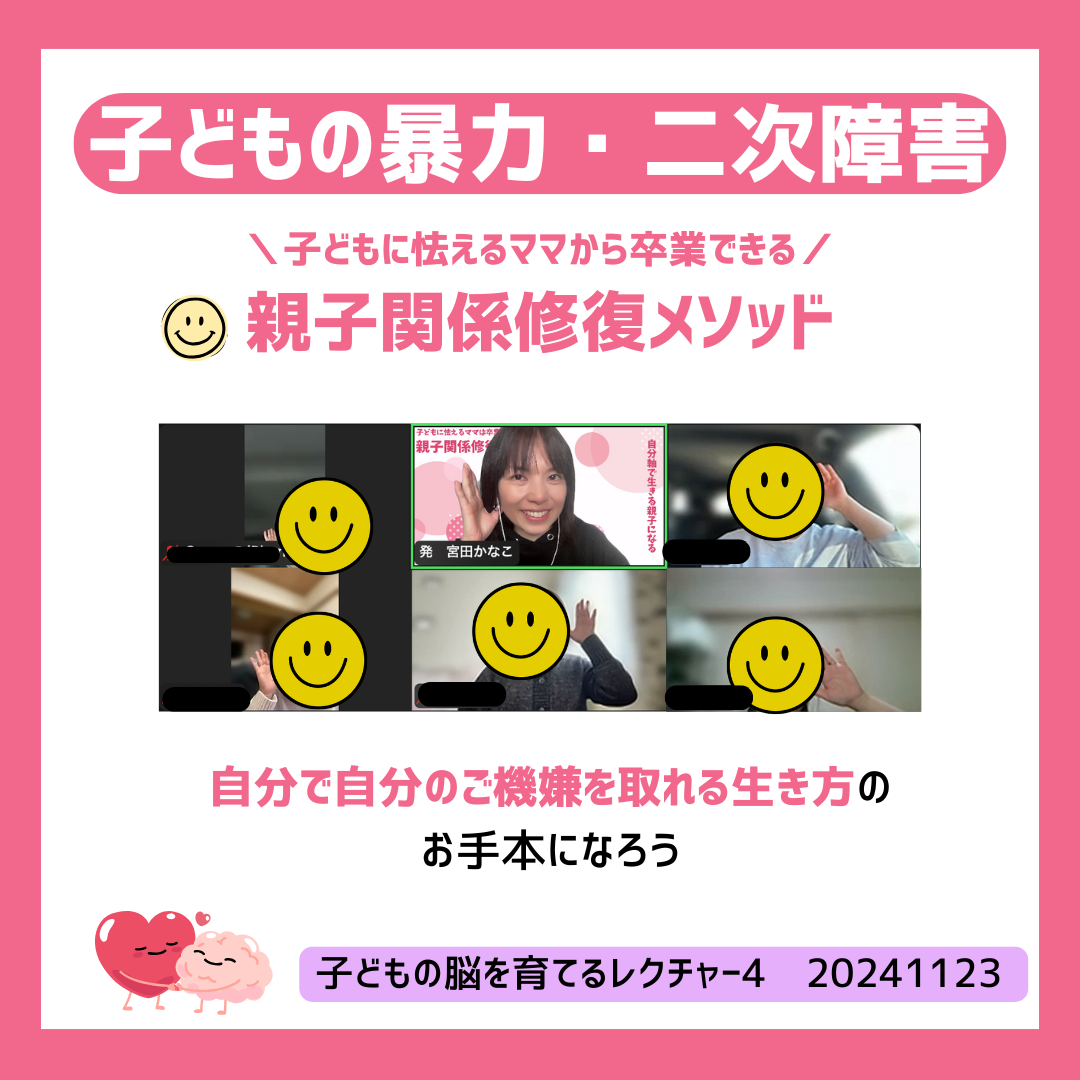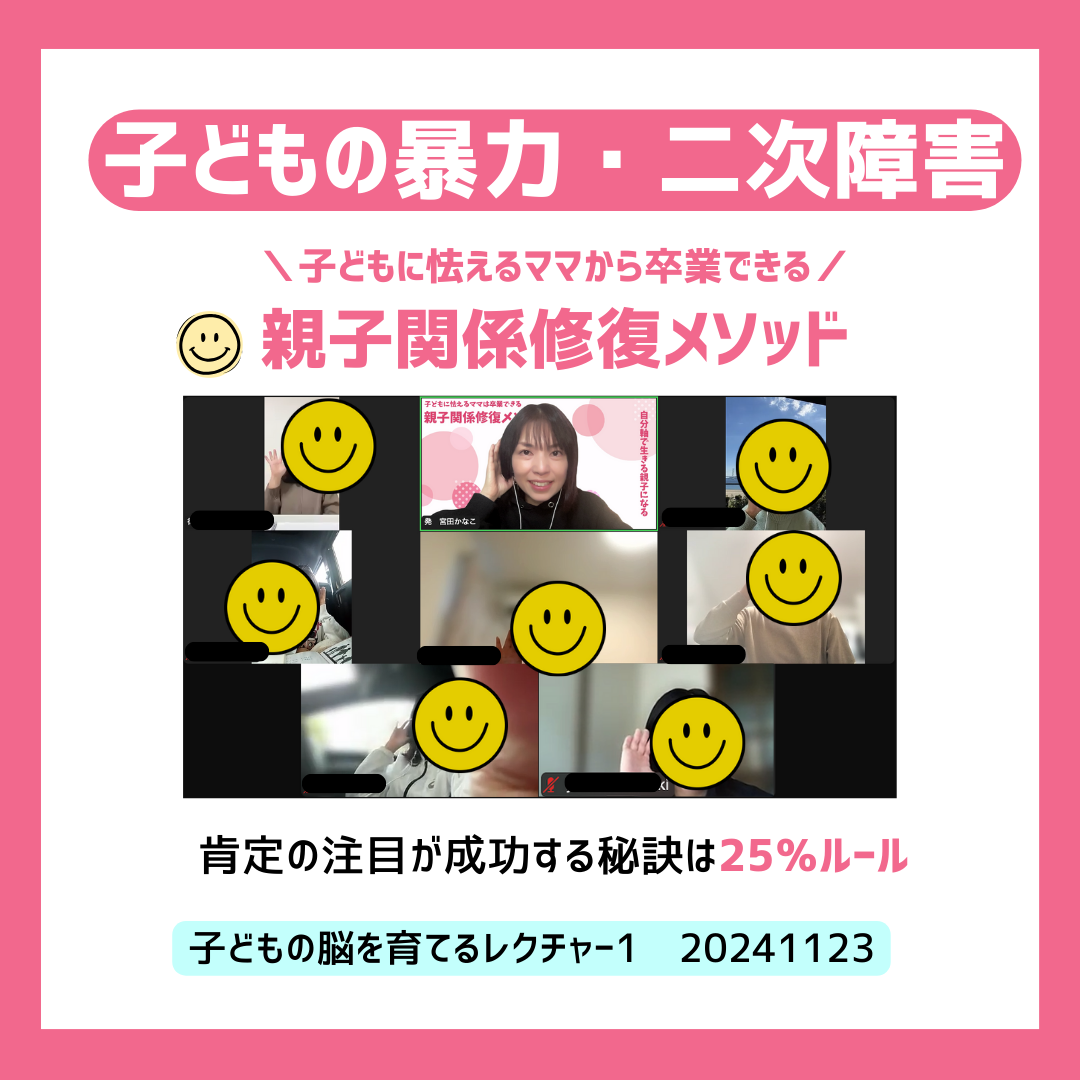 今からでも遅くない。子育てをやり直すつもりで実践していこうと思いました。(高3女子母)たくさん質問・相談ができて大変満足した会になりました。娘にも当たり前なことをとことん褒めて、ぎゅーってしてあげたいです。(小1女子・小3男子母)今日が最後の日となりました。この数カ月間は、あっと言う間でとっても楽しかったです。