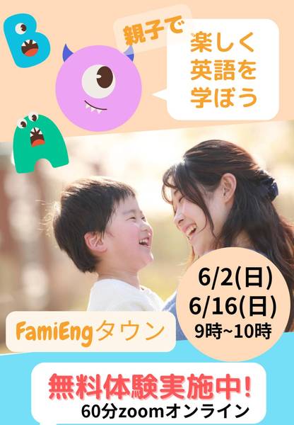 親子でできる英語の語彙力を遊びながら伸ばす事ができる♪英語アクティビティでたのしく♪遊ぶ時間あり今の日本の英語教育事情子育て事情、といった日本のママ達に知っておいてほしい衝撃のお話ありオンライン親子英会話コミュ二ティFamiEngタウンの中身大公開ありと盛りだくさんの内容だそうです!無料で体験できるのは各回限定6組さま