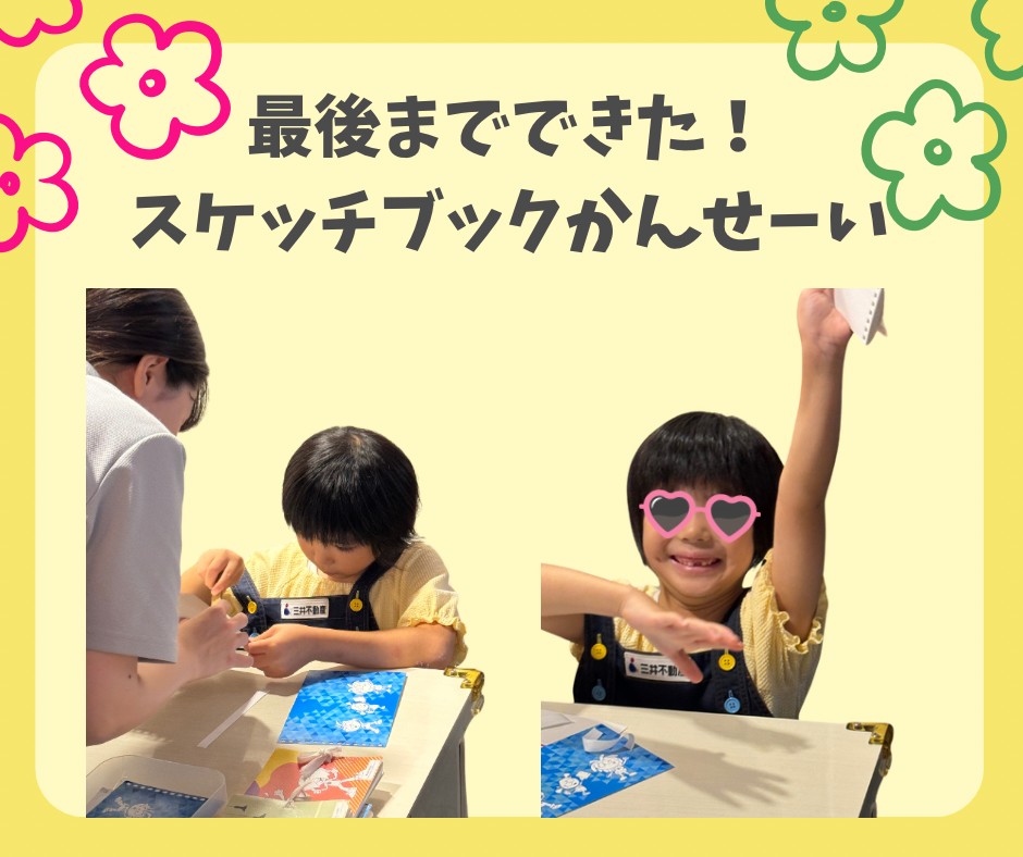 けれど今年は違いました!!娘はお絵描きが好きなのでスケッチブック作りをすることに^^キッザニアに入場してから4時間ほどたっていたので疲れてイライラしてないかな〜?座って作業できるかなぁ?と私が心配でドキドキ...しかし、私のドキドキを裏切って娘は✔︎ 開始時間まで待てた!