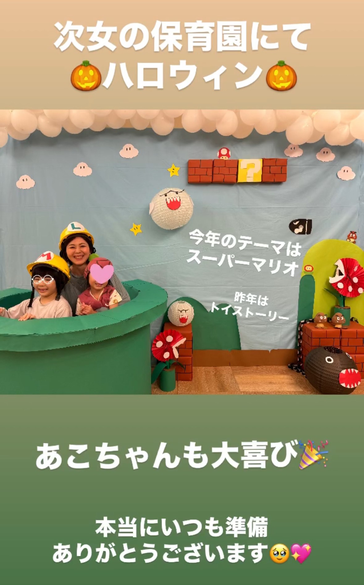 いざ、行ってみたら次女も保育士さんも「あこちゃ〜〜〜ん♡」と喜んでくれた!= 肯定のシャワー♪あこちゃんも嬉しそうにハイタッチしたりいろんな飾り付けを見て回ったり= 五感が刺激されまくり♪私も娘たちと写真が撮れてとても楽しいハロウィンになりました^^