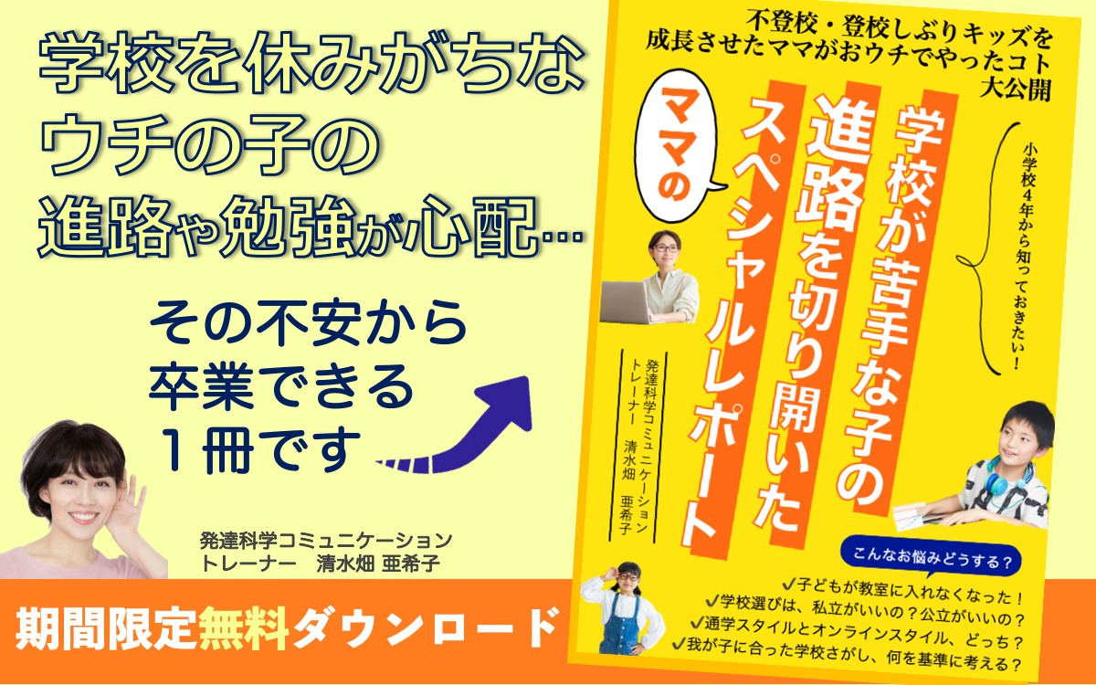 不登校キッズをおうちで楽しく発達させる!発達科学コミュニケーションマスタートレーナーの清水畑 亜希子(しみずばた あきこ)です。