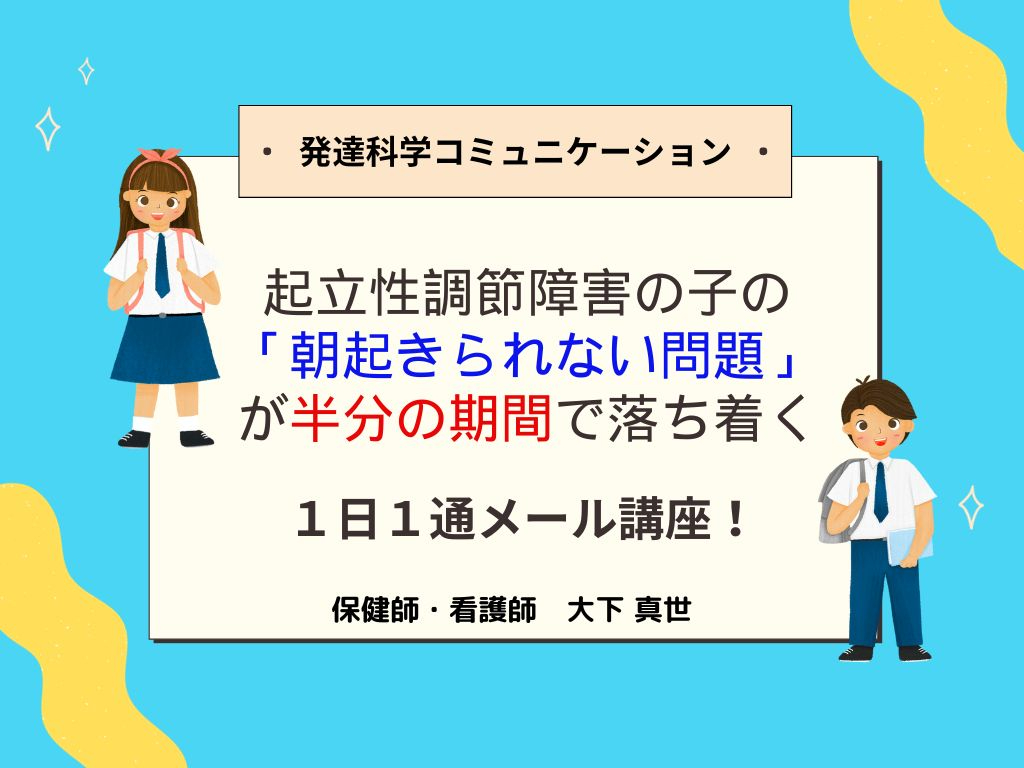 ⏬登録はこちら⏬ 【メルマガ登録】起立性調節障害のお子さんの「朝起きられない」問題を半分の期間で落ち着かせる1日1通メール講座 メールアドレス ※必須 名前(姓) ※必須 完璧主義の起立性調節障害の子が 思考のクセをリセットして 失敗を恐れず一歩踏み出す! 発達科学コミュニケーション トレーナーの大下真世です。 朝からめまいやふらつきで 学校を休むけれど、 午後は元気。 そんな子の1年後の回復率は たったの50%。 病院やカウンセリングに行っても ママはただ待つだけ 一向に動き出さないんです。 医師の夫も看護師の私も お手上げ状態。 でもあることをすると… 息子は自ら学校復帰。 科学甲子園の全国大会。 アメリカ留学、 1年間の勉強のブランクを乗り越え、 私立高校の特別奨学生試験にも合格 しました。 カギはストレス思考をやわらげ ポジティブマインドを育てる たった5分の声かけだけ。 そこで私は日本で唯一 「起立性調節障害」の子が 最短ルートで回復するメソッドを 開発しました。 起立性調節障害の子の 思考のクセをリセットし、 最短ルートで回復へ導く ママの声かけ術を 1日1通の無料メルマガで お届けします! ⏬登録はこちら⏬ 【メルマガ登録】起立性調節障害のお子さんの「朝起きられない」問題を半分の期間で落ち着かせる1日1通メール講座 メールアドレス ※必須 名前(姓) ※必須