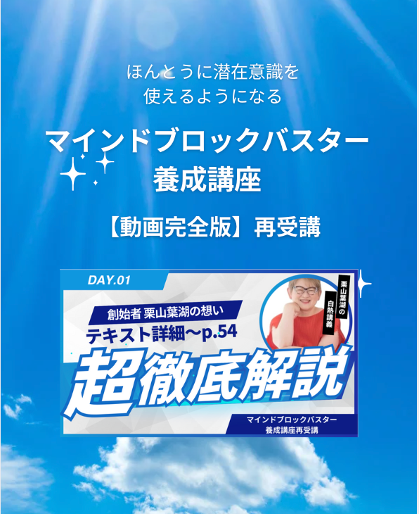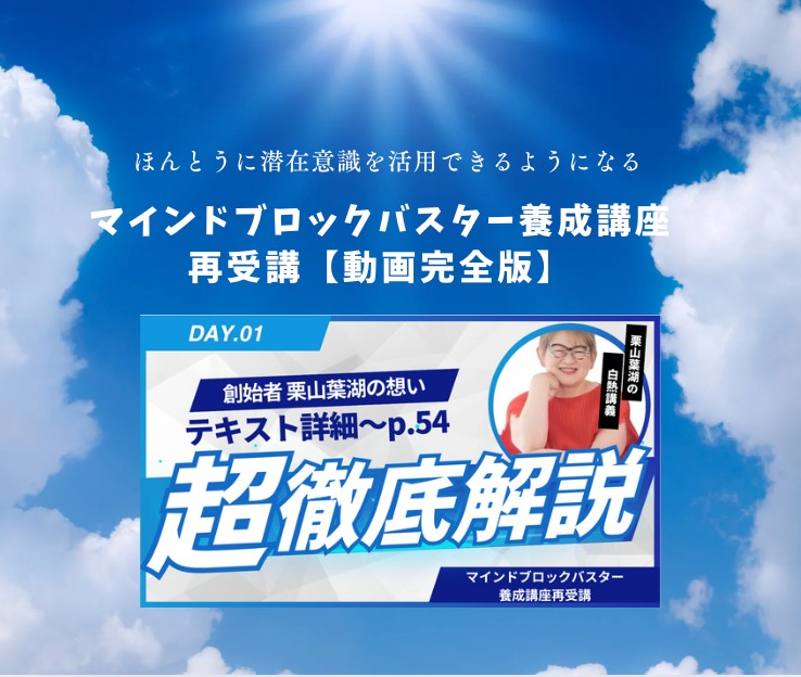 忙しいみなさんだからこそ、動画再受講をお勧めします。この動画を購入できるのは過去にマインドブロックバスター養成講座を卒業した方だけです。どんなに講座が良くても月日が経っていると人の記憶は曖昧になってます。「自分の思い込み」や「うろ覚え」のまま実は効果が上がってないブロック解除、難しく考えすぎて使う頻度が落ちている、やり方を忘れてしまっているので長いこと使ってないというお声をいただいています。このチャンスに創始者の栗山葉湖が直接教える動画から再度学び直し、改めてブロック解除してみることでもっと望んでいる人生にシフトチェンジしてください。