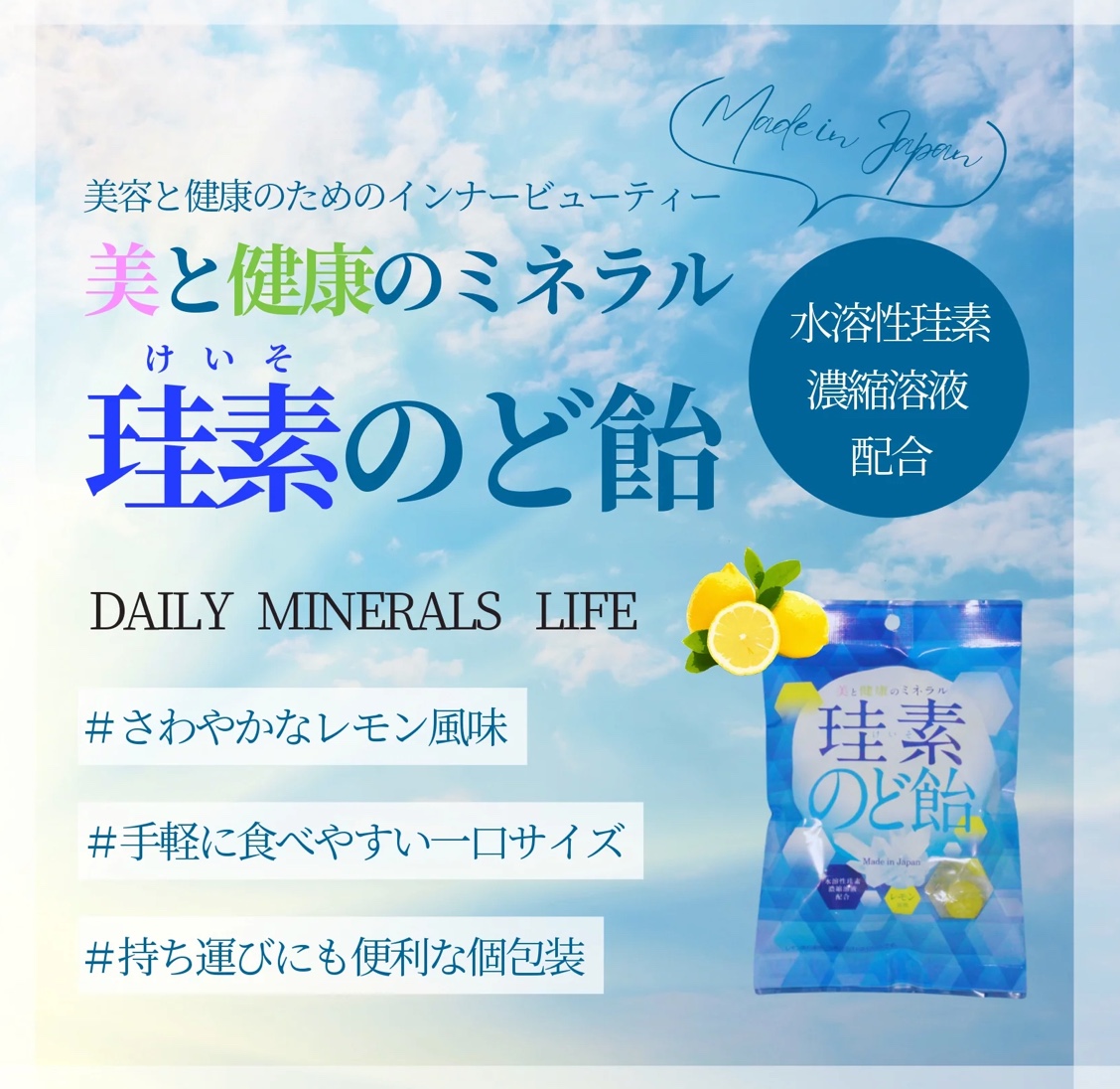 おいしく「ミネラル補給」「水溶性珪素濃縮溶液」を配合した健康美容''のど飴''です。