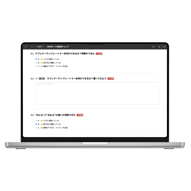 「 十分に理解している / 部分的に理解している / 理解が不十分 」の3択で自分の現在地を瞬時に可視化し、次のアクションが明確になります。