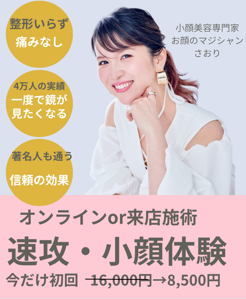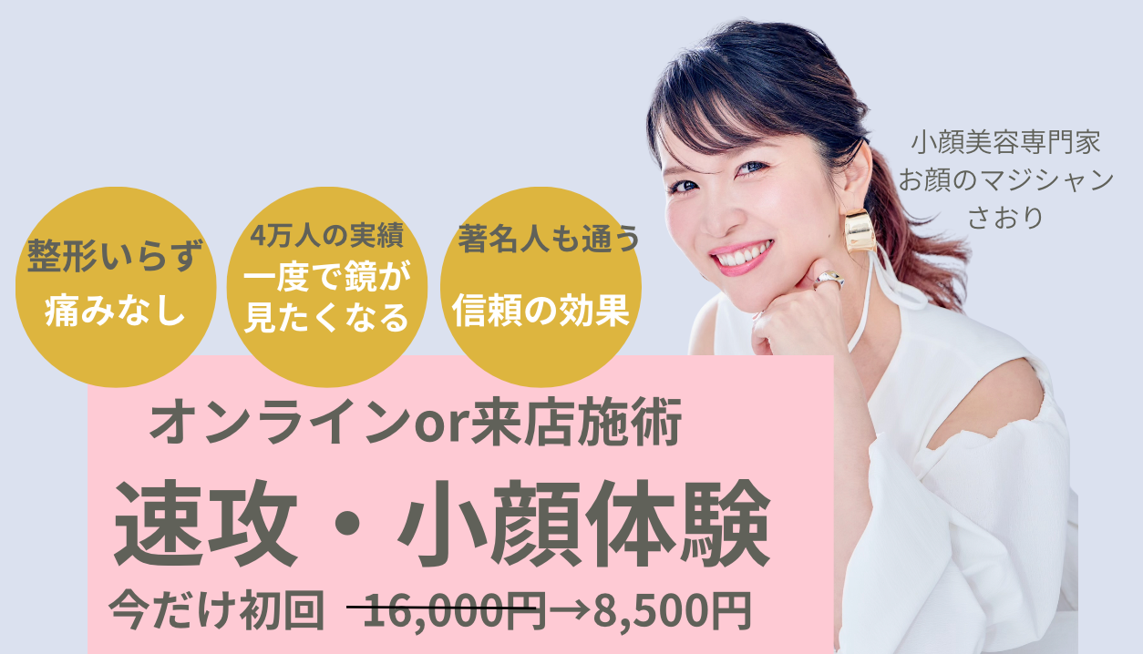 小顔体験をオンラインでセルフで、または来店の方はお顔のマジシャンさおりが施術させていただきます。