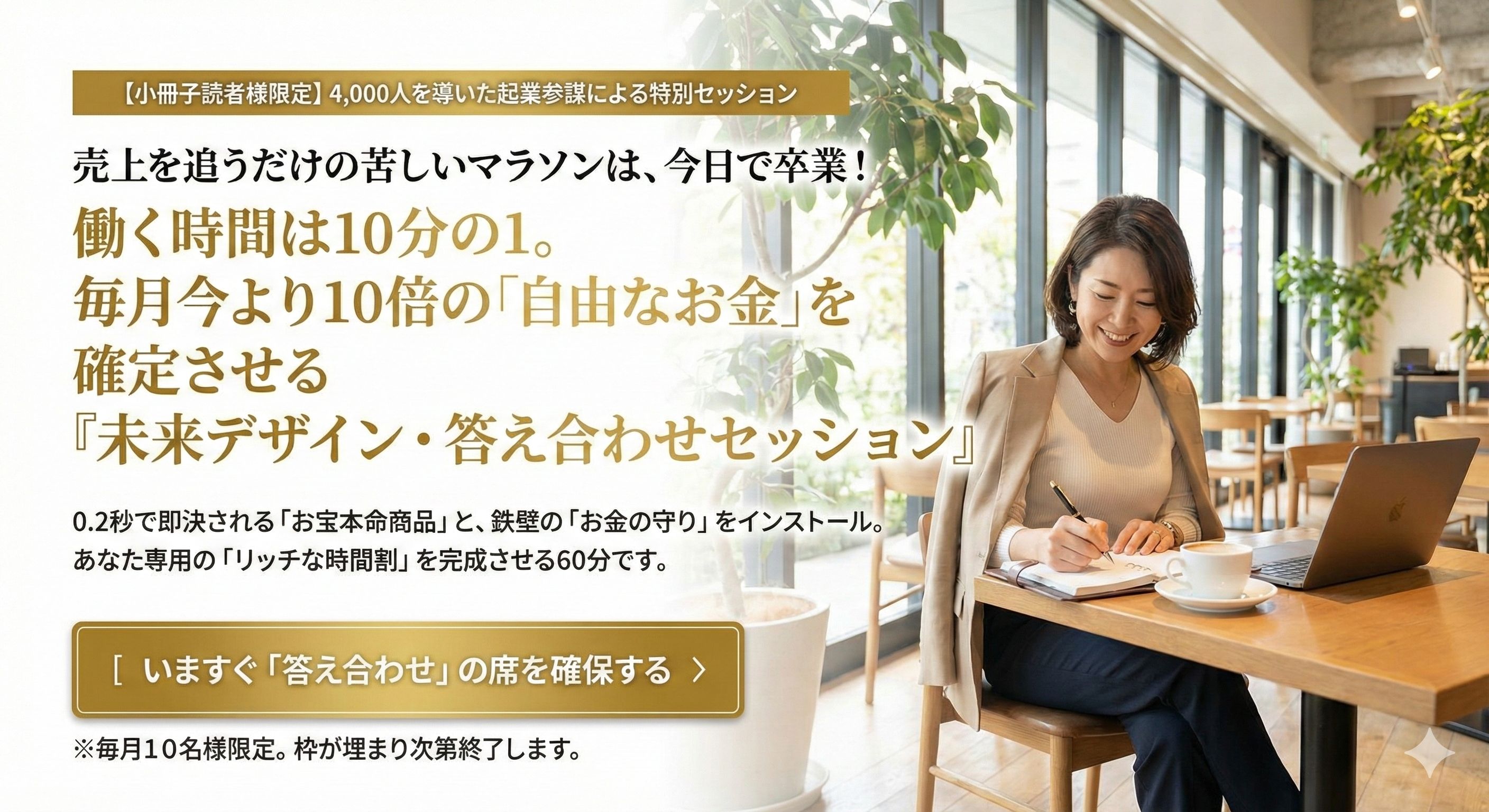 通常〇〇円で提供している個別コンサルティングですが、本気で「忙しい貧乏」から抜け出したいと願い、小冊子を最後まで読んでくださったあなたへ。