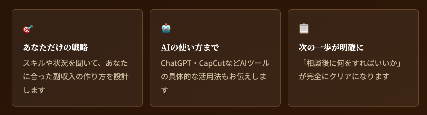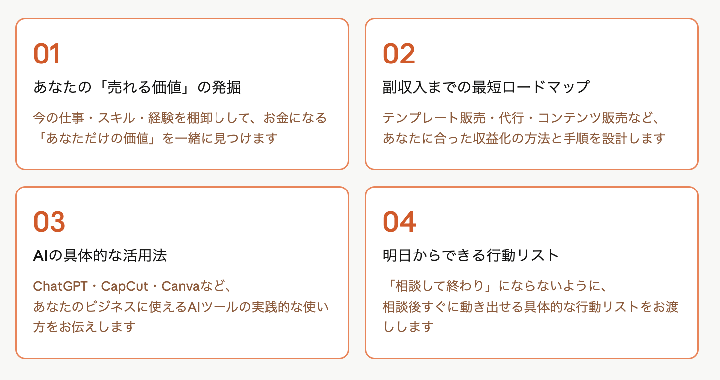 現在の状況・スキル・目標をヒアリングし、あなただけの戦略を一緒に設計します