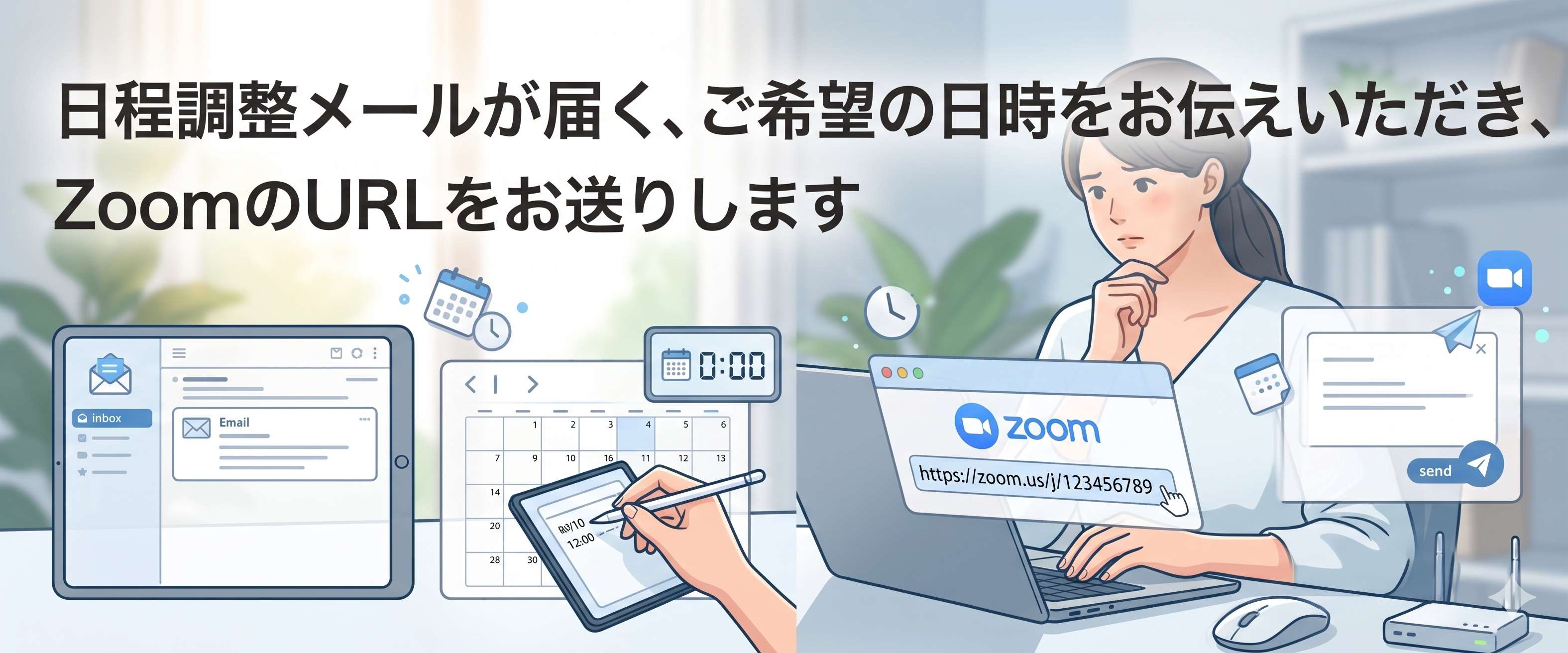 ご希望の日時をお伝えいただき、ZoomのURLをお送りします