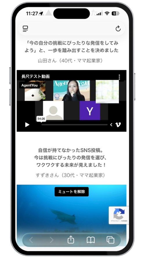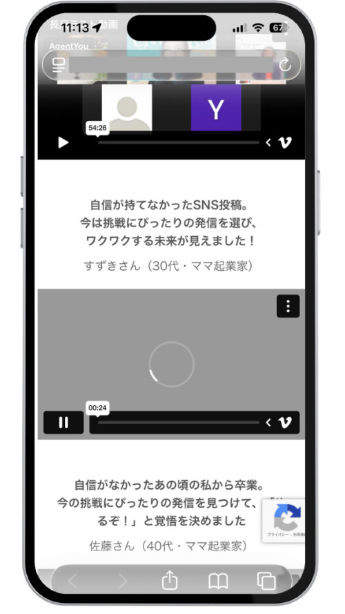 ページを開いた瞬間にお客様の声やインタビュー動画が一斉に動き出す。